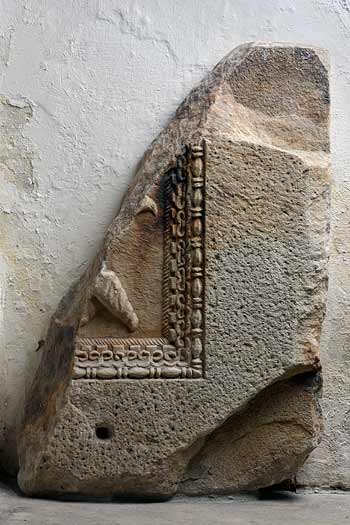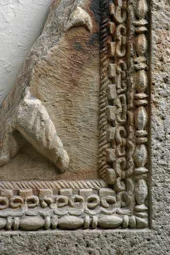 - Geglätteter Randstreifen, Rest eines eingetieften Rechteckfeldes mit Profilrahmen (Perlstab, Blattkyma, Zahnschnitt, tordierter Rundstab), im Bildfeld Rest eines Blitzbündels (vermutlich von einem Adler getragen).