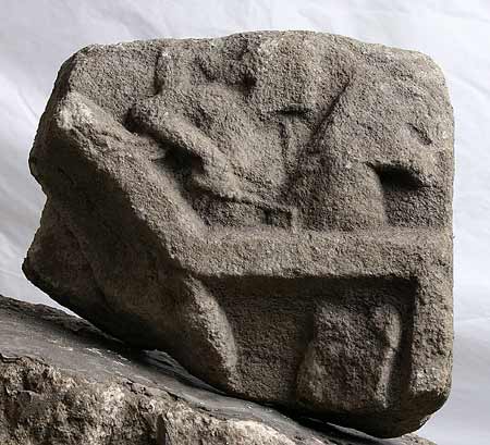 - Mythos (Mithras): Von der Darstellung der Stiertötung (Tauroktonie) die rechte obere Ecke mit Luna (nach rechts gewandte Halbfigur, Peitsche in der Rechten, vor ihr Pferdekopf. Links Rest des Bogenrahmens des Hauptbildes, unterhalb Rahmenleiste und Kopf des Cautes.