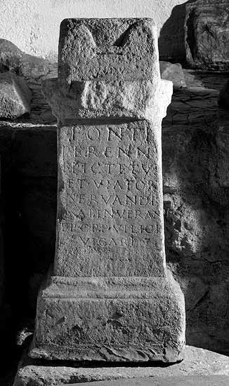 - Fonti / perenni / Epictetus / et Viator / Servandi / Q(uinti) Sab(ini) Verani / t(ertiae) p(artis) c(onductoris) p(ublici) p(ortorii) vilici / vicari(i)
