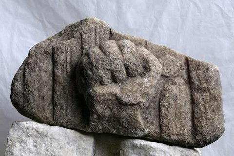 - Mythos (Mithras ?): vor vertikal gegliedertem Reliefgrund geballte Faust, die einen kurzen Stab mit flacher Spitze hält.