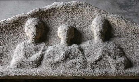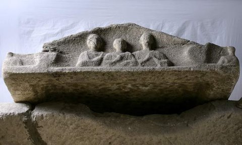 - Dachförmiger Aschenkistendeckel. Im Giebelfeld Brustbilder einer Familie: links Frau im Mantel, in der Mitte Kind in Ärmeltunica, in der Rechten Vogel (?), rechts Mann im Sagum mit Rolle (volumen) in der Linken. In den vier Akroteren Büsten (Jahreszeiten ?).