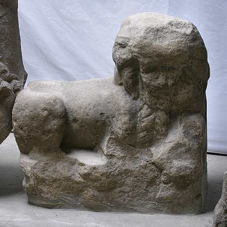 - Kopf mit gelocktem Haar (bartlos ?) mit hohem Polos, der von gekreuzten Bändern umwunden wird. Rechts und links liegender Löwe mit Widderkopf in den Pranken.