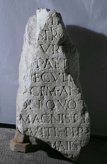 - [I(ovi)) O(ptimo) M(aximo)] / [pro salute] / [Imp(eratoris) Caes(aris)] / [M(arci) Aur]eli [Ant(onini)] / [d(omini) no]stri A[ug(usti)] / [---] Ture[li]/[us] Paet[us] / [sp]ecul(ator) l[eg(ionis)] / [X] Gem(inae) An[t]/on(inianae) quot / magnis et / multis peri/[culis] maiest(ati) / [ac numin]i [eius] / [dev(otus) fel(iciter) evasit?]