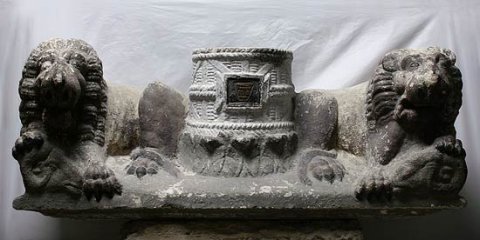 - Geflochtene Ciste mit kleiner tabula ansata steht auf einem Blätterkranz. Seitlich liegende Löwen mit widderköpfen in den Pranken. Basisplatte einfach profiliert.