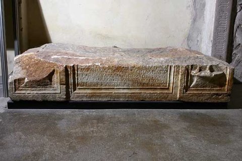 - Vorderseite: gerahmtes Schriftfeld zwischen Seitenfeldern mit Figuren auf Podesten (Genius ?). Auf den Nebenseiten Gefäß mit Weinranken.