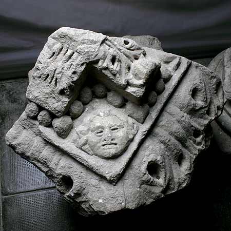- Gesimsprofil. Von oben: Akanthusblattfries, eckige Leiste, Reihe von Kugeln, Konsolen mit Akanthusblatt, zwischen diesen Masken.