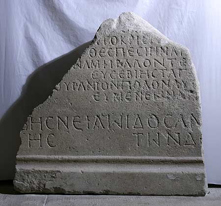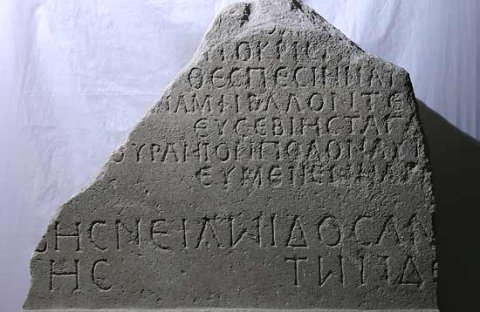 - griechisch : [---]ΝΤΟ ΚΡΙΣΙ[---] / [---] ΘΕΣΠΕΣΙΗΝ ΑΙ [---] / [---]Ν ΑΜΦΙΒΑΛΟΝΤΕΣ [---] / [---] ΕΥΣΕΒΙΗΣ ΤΑΓΑ [---] / [---] ΟΥΡΑΝΙΟΝ ΠΟΛΟΝ ΑΥ [---] / [---]ΕΥΜΕΝΕΙΙΝΑΡ [---] / [---]ΒΗΣ ΝΕΙΛΩΙ ΔΟΣΑΝ [---] / [---]ΗΣ ΤΩΝΔΕ [---]