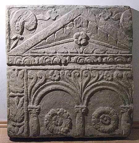 - Eingeschriebener Giebel mit Blattrosette, auf den Schrägen Delphine. Haupbildfeld mit zwei Bögen, darunter Rosetten.