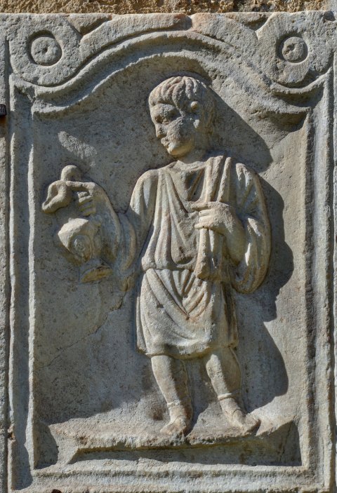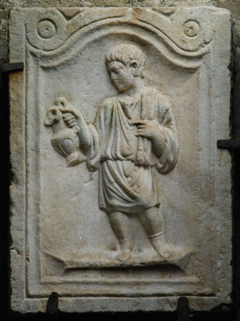 - Diener: in Bogennische auf niedrigem Podest Mann in kurzer Tunica und Stiefeln, in der Rechten Kanne, über der linken Schulter mappa.