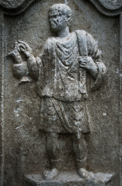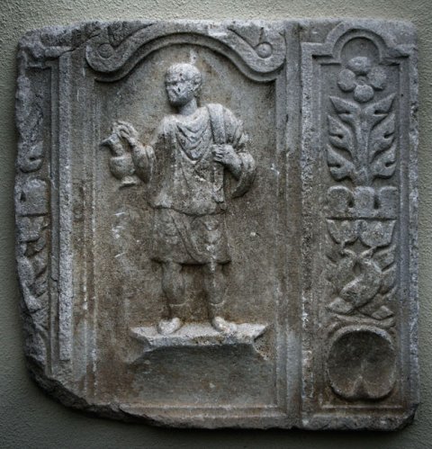 - Diener: Unter flachem Bogen mit Volutenenden Mann in kurzer Tunica und Stiefeln auf Podest, in der Rechten Kanne, über der linken Schulter mappa. Seitlich je ein schmales Feld mit rundbogigem Abschluß, darin unten runde Scheibe, darüber zwei Delphine und Akanthuspflanze, oben Rosette.