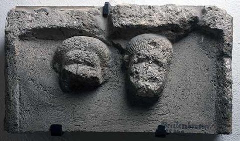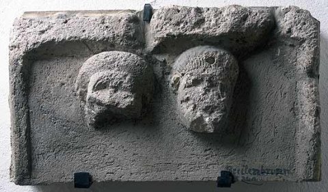 - Zwei Köpfe (Ehepaar) : links einheimische Frau mit Haube, rechts Mann mit in die Stirn gekämmten Haarsträhnen.
