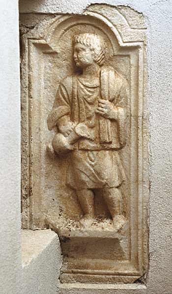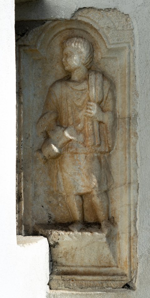 - Diener: in Bogennische Mann auf Podest, kurze Tunica, in der Rechten Kanne, über der linken Schulter mappa.
