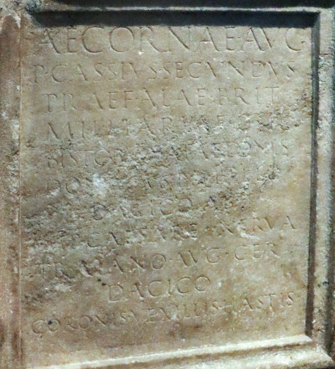 - Aecornae Aug(ustae) / P(ublius) Cassius Secundus / praef(ectus) alae Brit(annicae) / milliariae c(ivium) R(omanorum) / bis torquatae donis / donatus bis bello / Dacico ab / imp(eratore) Caesare Nerva / Traiano Aug(usto) Ger(manico) / Dacico / coronis vexillis hastis