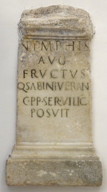 - Nymphis / Aug(ustis) / Fructus / Q(uinti) Sabini(i) Verani / c(onductoris) p(ublici) p(ortorii) ser(vus) vilic(us) / posuit
