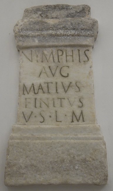 - Nymphis / Aug(ustis) / Matius / Finitus / v(otum) s(olvit) l(ibens) m(erito)