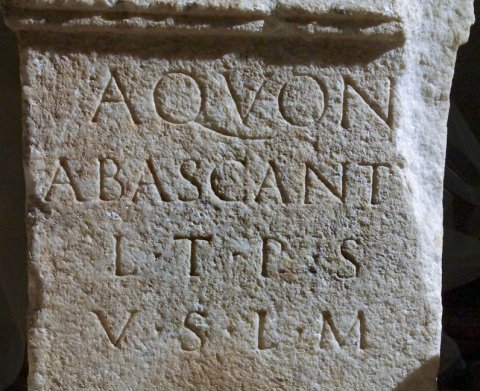 - Aquoni / Abascantus / L(ucii) T(?) P(?) s(ervus) / v(otum) s(olvit) l(ibens) m(erito)