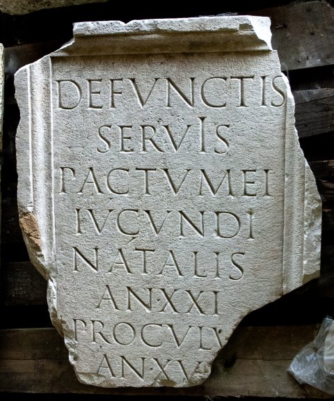 - Defunctis / servis / Pactumei / Iucundi / Natalis / an(norum) XXI / Proculu[s ] / an(norum) XV[---