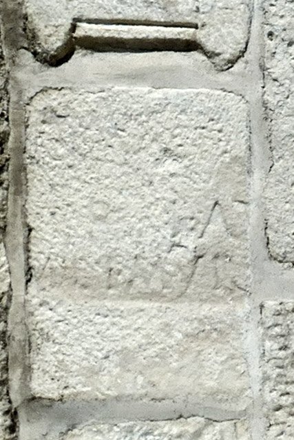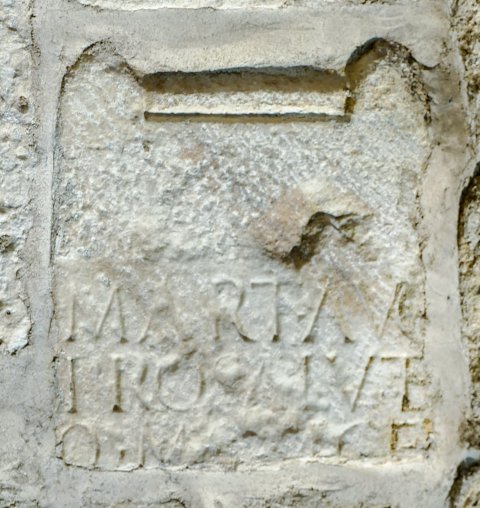 - unten abgebr., unteres Fragment vermutlich der daneben eingemauerte Stein mit Rest der Weiheformel (Hinweis von I. Weber-Hiden)