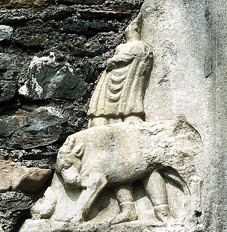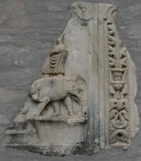 - Opferszene: im Mittelfeld mit geschwungenem oberen Rahmen rechts auf Podest Stier und dahinter Diener mit kurzer Tunica und Schuhen. Rechts schmales Bogenfeld mit Krater mit Pflanze über Blattornament.