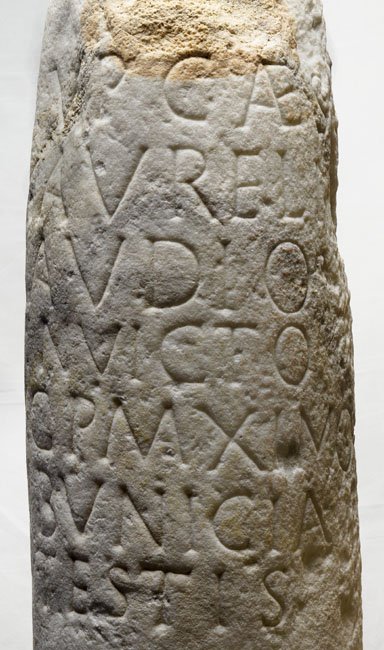 - Imp(eratori) Caes{ari} / M(arco) Aureli(o) / Claudio [P(io)] / f(elici) invicto / Aug(usto) p(ontifici) maximo / tribunicia(e) / [po]tes(ta)tis