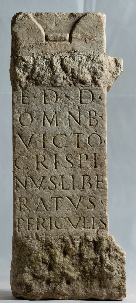 - [I(ovi) O(ptimo) M(aximo)] / e(t) d(is) d(eabusque) / omnib(us) / Victor(ius?) / Crispi/nus libe/ratus / periculis [---