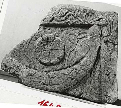 - Hauptbild einer Grabstele: Girlande mit Tänien, darüber Rosette. Auf der seitlichen Rahmenleiste Blattornament, auf der oberen Efeuranke.