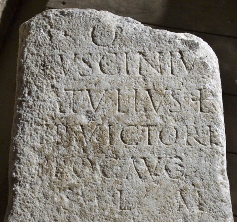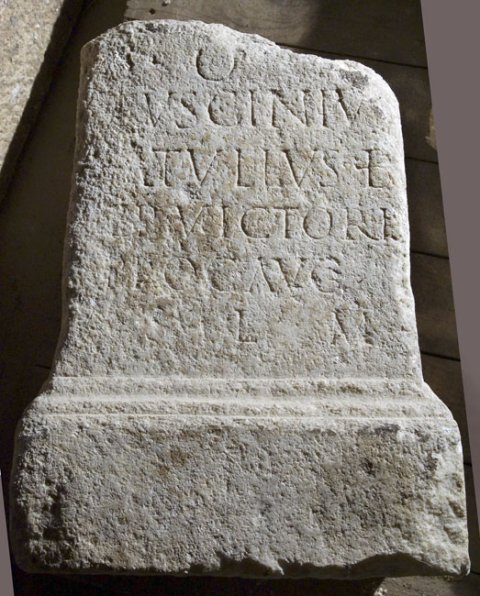 - I(ovi) o(ptimo) m(aximo) / C(aius) Fuscinius / Catullus b(ene)f(iciarius) / Ulp(ii) Victoris / proc(uratoris) Aug(usti) / v(otum) s(olvit) l(ibens) m(erito)