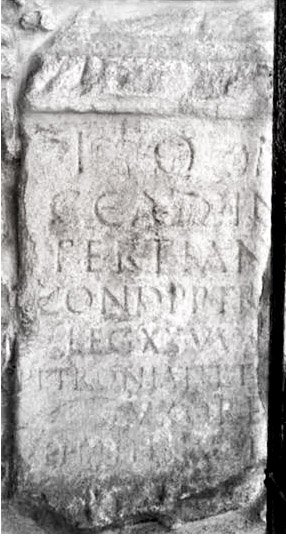 - I(ovi) o(ptimo) m(aximo) / C(aius) Calcin[ius] / Tertian[us] / cond(uctor) p(ublici) p(ortorii) tr[ib(unus) mil(itum)] / leg(ionis) XX V(aleriae) v(ictricis) c[um] / Petronia Terti[a] / uxore [pro] / se et fili(i)s vot(um) [s(olvit)]