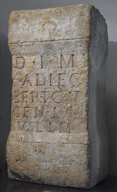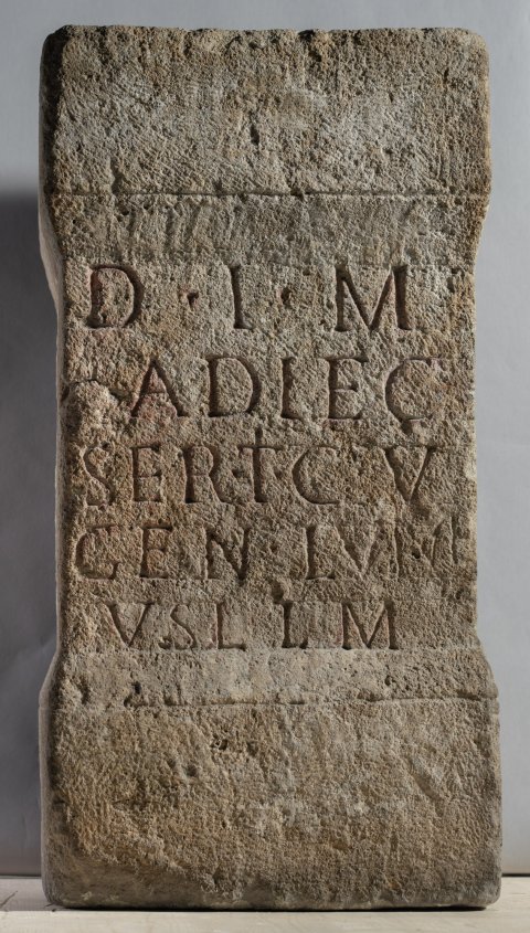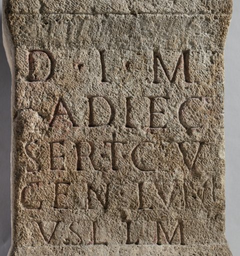- D(eo) I(nvicto) M(ithrae) / Adiec(tus) / ser(vus) T(iti) c(onductoris?) v(ilicus?) / Gen(itori?) Lum(inis?) / v(otum) s(olvit) l(ibens) l(aetus) m(erito)