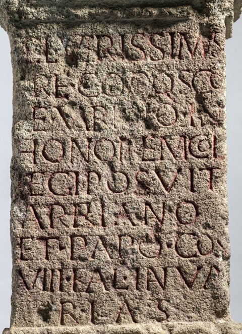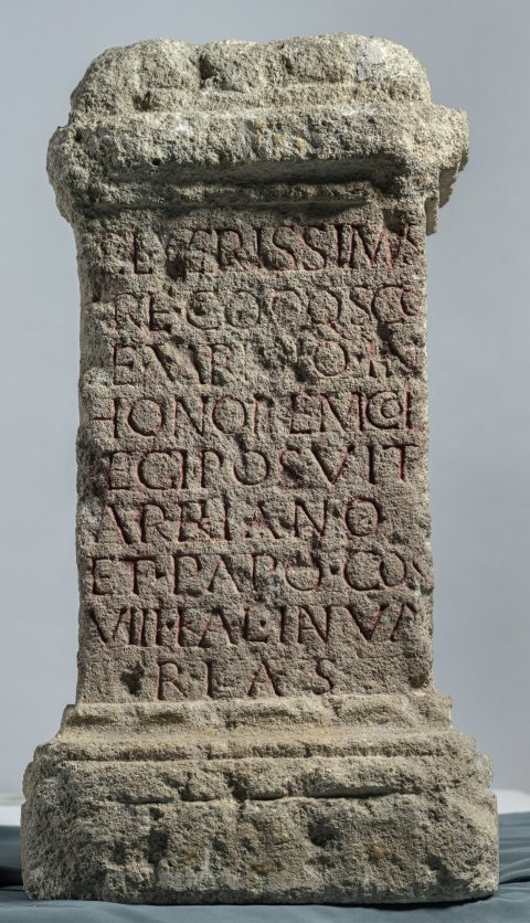 - Ael(ius) Verissimus / pr(a)e(fectus) co(llegii) q(uin)q(uennale) sc(h)o/l(a)e Vari[an]o in / honorem col/legi(i) posuit / Arriano / et Papo co(n)s(ulibus) / VIII Kal(endas) Ianua/rias