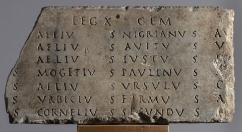 - ---] leg(ionis) X Gem(inae) [---] // ]s / [---]s / [---]s / [---]us / [ // Aelius Nigrianus / Aelius Avitus / Aelius Iustus / Mogetius Paulinus / Aelius Ursulus / Urbicius Firmus / Cornelius Secundus [ // Au[---] / V[---] / Id[---] / A[---] / C[---] / A[---
