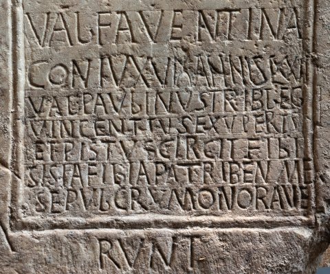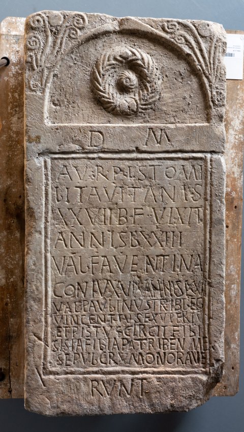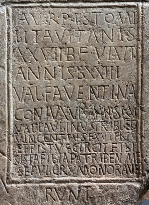 - D(is) M(anibus) // Aur(elio) Pisto mi/litavit annis / XXVII b(ene)f(iciarius) vixit / annis LXXIII / Val(eria) Faventina / coniux vix(it) annis LXXII / Val(erius) Paulinus trib(unus) leg(ionis) / Vincentius Ex(s)uperi(u)s / et Pistus circit(or) fili(i) / Sisia filia patri ben(e) me(renti) / sepulchrum (h)onorave//runt