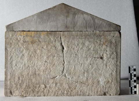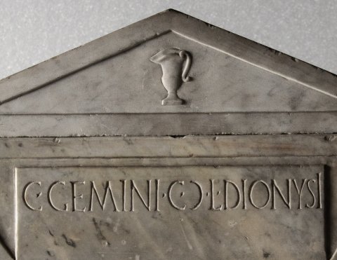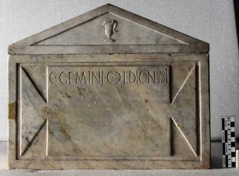 - Kasten mit dachförmigem Deckel. Im gerahmten Giebelfeld Kanne. Inschrift in tabula ansata.