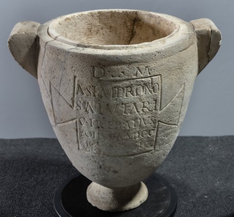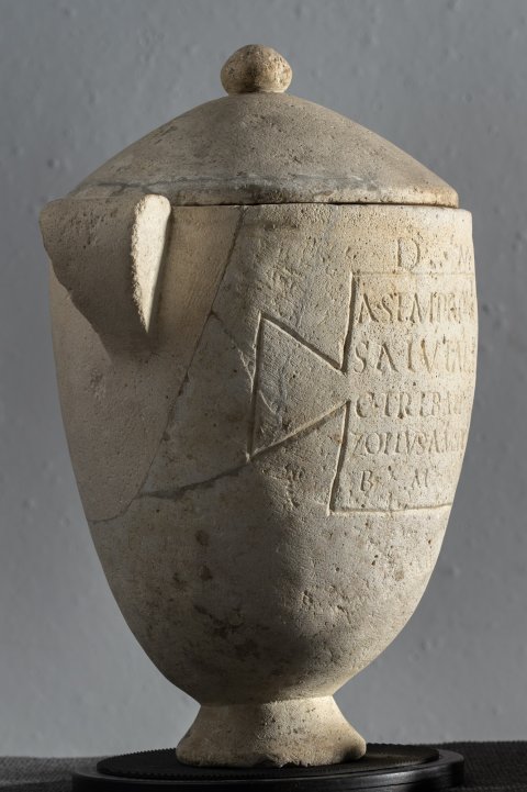 - Ovoides Gefäß mit zwei Griffen und konischem Deckel. Inschrift in eingeritzter tabula ansata.