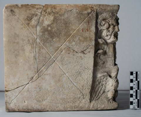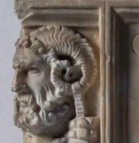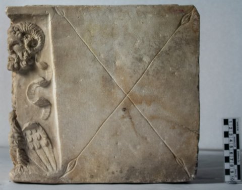 Mythische Figur (Jupiter Ammon), Adler, Tiere : Schriftfeld mit profiliertem Rahmen, seitlich davon an den Ecken der Urne bärtige Köpfe mit Widderhörnern, an denen eine Girlande mit Tänien hängt. Zwischen Girlande und Schriftfeld Gorgoneion, unter der Girlande Vogel und Schlange, unten an den Ecken je ein stehender Adler mit ausgebreiteten Flügeln.