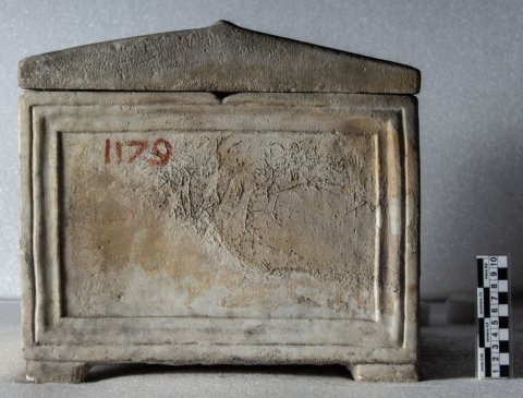 - Schmalseiten und Schriftfeld mit profiliertem Rahmen, auf der linken Schmalseite tabula ansata. Flacher dachförmiger Deckel.