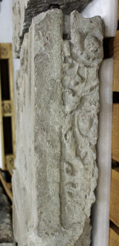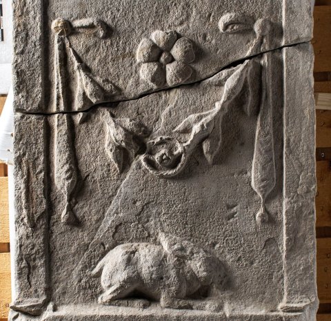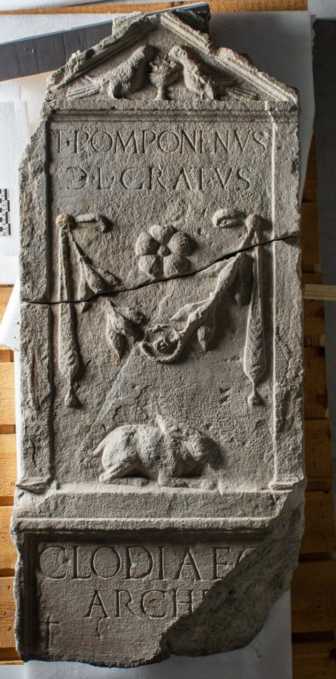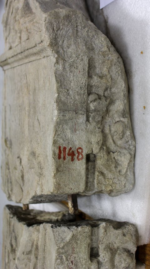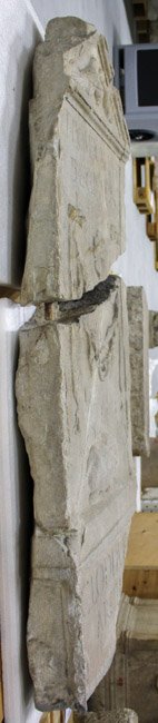 - Tiere: im gerahmten Giebelfeld Gefäß mit hohem Fuß zwischen zwei Tauben, darüber Rosette (?). Pilastergerahmtes Bildfeld mit zwei Inschriftzeilen oben, darunter Rosette und Blattgirlande mit Tänien und kauernder Hase. Unterhalb profiliert gerahmtes Schriftfeld. Auf der rechten Nebenseite Ranken.