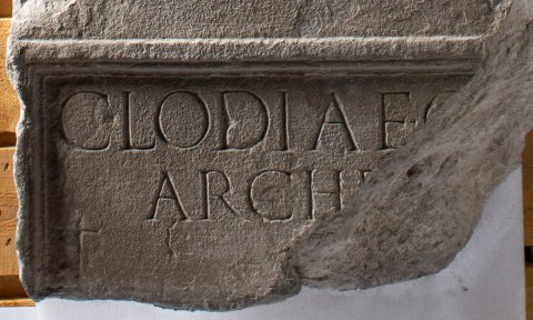 - T(itus) Pomponenus / |(mulieris) l(ibertus) Gratus / Clodiae C(ai) [l(ibertae)] / Arche / t(estamento) f(ieri) [i(ussit)]