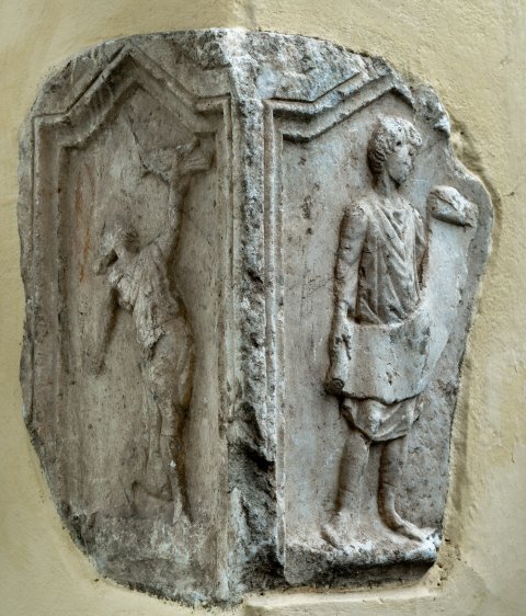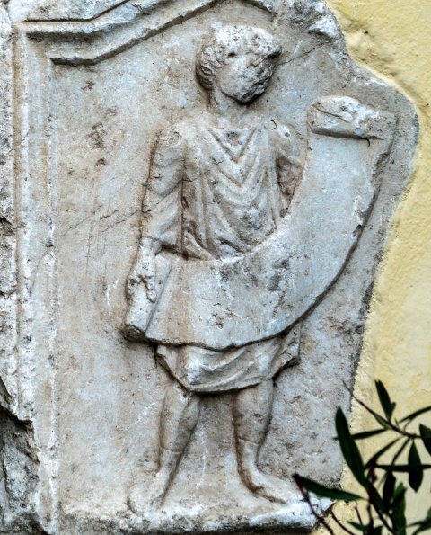Eckblock: auf der Vorderseite in Giebelfeld Diener (Librarius - Scriba) auf flachem Podest, kurze Tunica, in beiden Händen geöffnete Rolle (volumen).
