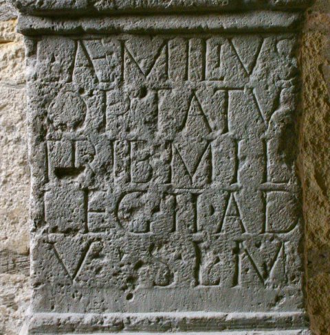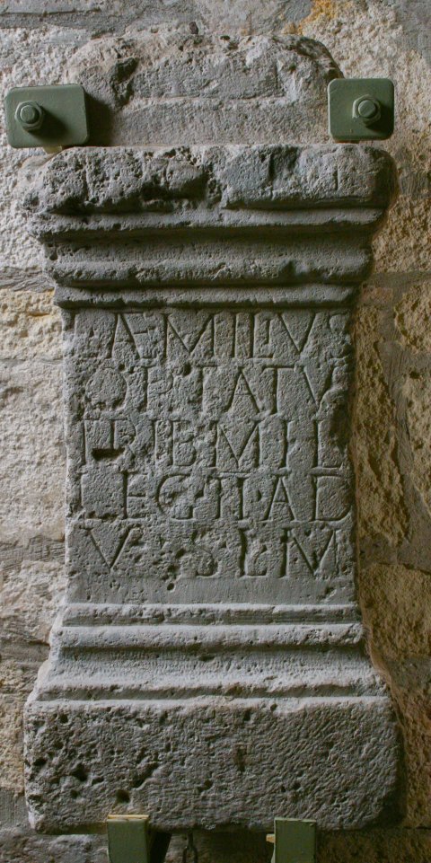 - I(ovi) O(ptimo) M(aximo) // L(ucius) Aemilius / Optatus / trib(unus) mil(itum) / leg(ionis) II ad(iutricis) / v(otum) s(olvit) l(ibens) / m(erito)