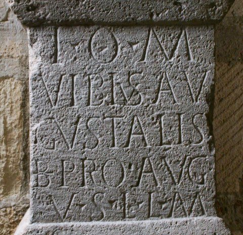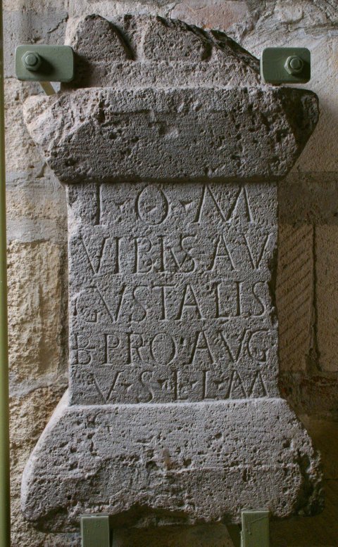 - I(ovi) O(ptimo) M(aximo) / Vibius Au/gustalis / b(ene)f(iciarius) pro(curatoris) Aug(usti) / v(otum) s(olvit) l(ibens) l(aetus) m(erito)