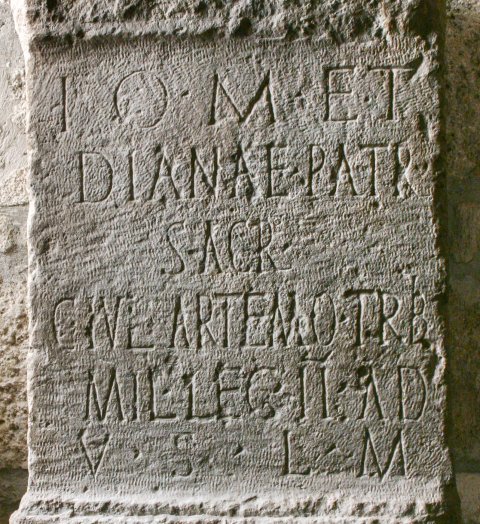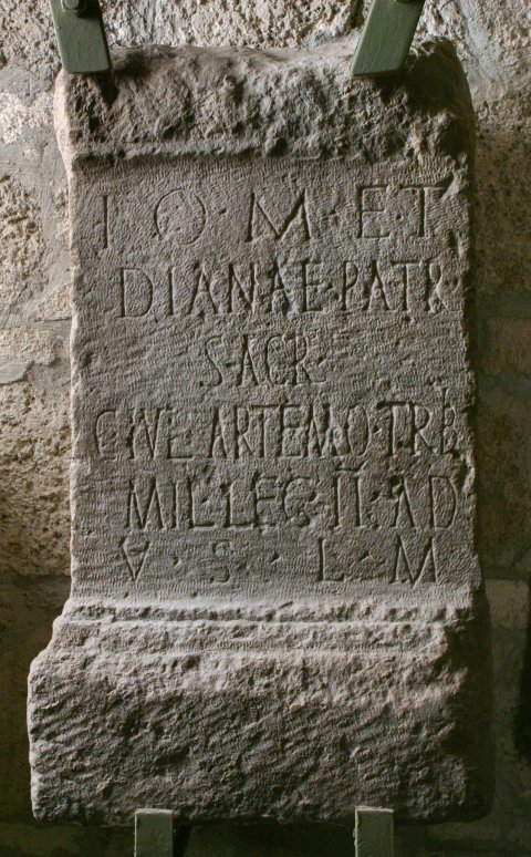 - I(ovi) O(ptimo) M(aximo) et / Dianae Patr(iae?) / sacr(um) / C(aius) Iul(ius) Artemo trib(unus) / mil(itum) leg(ionis) II ad(iutricis) / v(otum) s(olvit) l(ibens) m(erito)