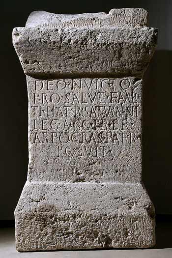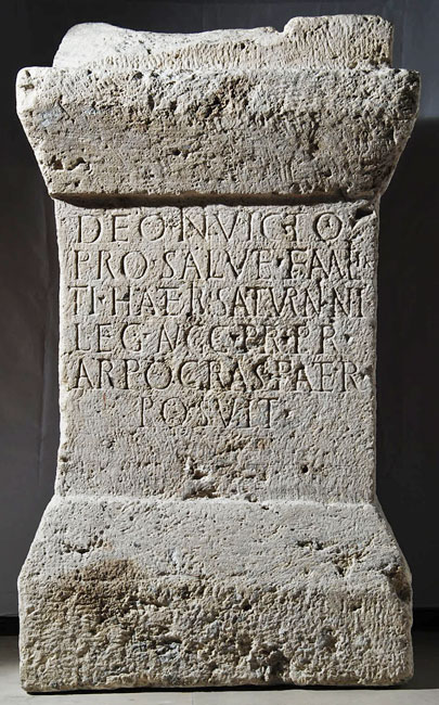 - Deo Invicto / pro salute familiae / Ti(beri) Hateri Saturnini / leg(ati) Augg(ustorum) pr(o) pr(aetore) / Arprocras pater / posuit