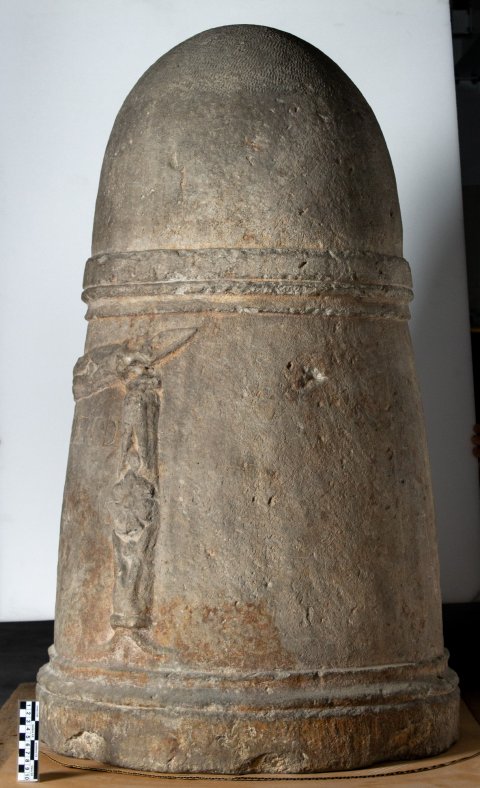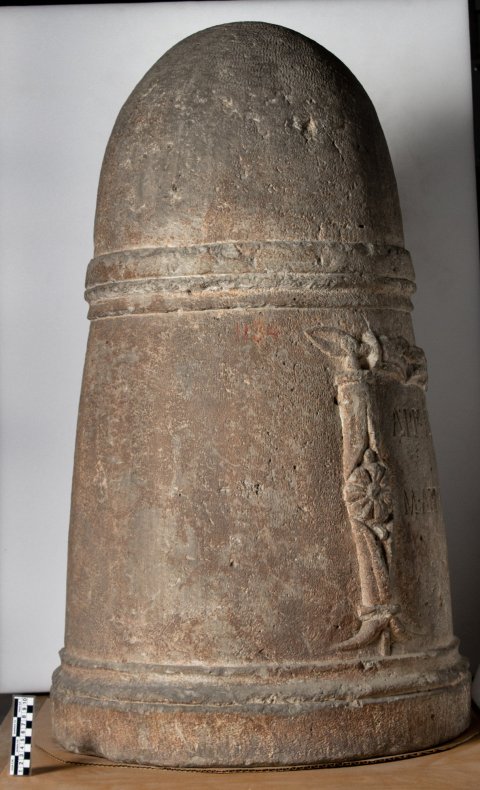 - Konischer, oben halbkugeliger Stein, oberhalb des Schriftfeldes und am unteren Rand einfaches Profil. Inschrift an drei Seiten von Girlande gerahmt.