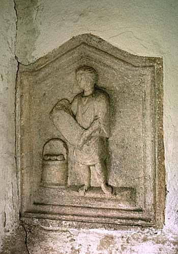 - Diener (Librarius- Scriba): unter Giebel auf flachem Podest Mann in kurzer Tunica mit geöffneter Rolle (voluem) in den Händen, vor ihm Rollenbehälter.