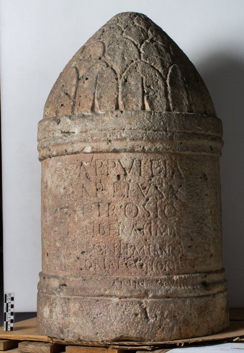 - Zylindrischer Stein mit kegelförmigem Abschluss mit geschuppter Oberfläche. Einfaches Profil am oberen und unteren Rand des Zylinders, dazwischen Inschrift.