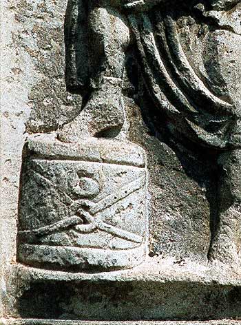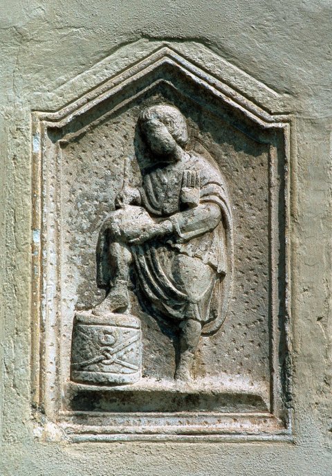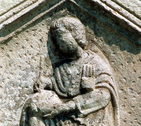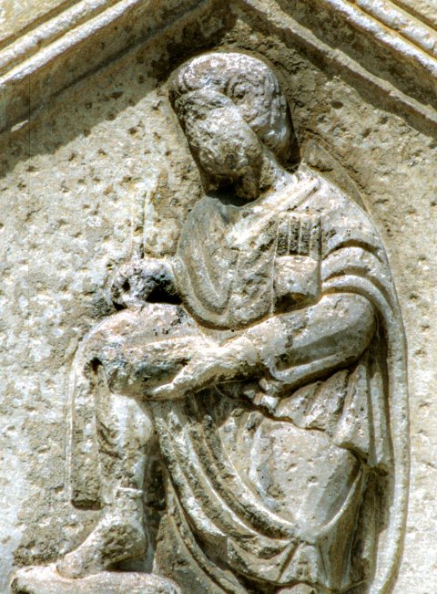 - Diener (Librarius - Scriba): in Giebelnische auf flachem Podest Mann in kurzer Tunica, Mantel und Schuhen, das rechte Bein auf einen verschnürten Rollenbehälter gestellt, unter dem linken Arm Schreibzeug (Etui mit Federn), schreibt mit Rohrfeder auf Rolle (volumen).