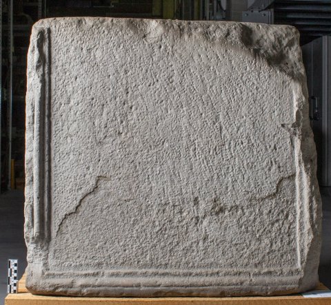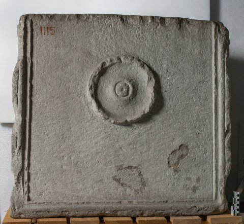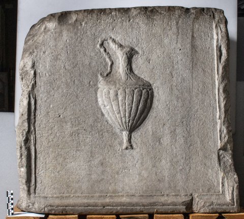 - Schriftfeld mit profiliertem Rahmen. auf der linken Nebenseite Kanne, auf der rechten Omphalosschale (patera).