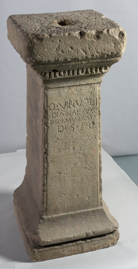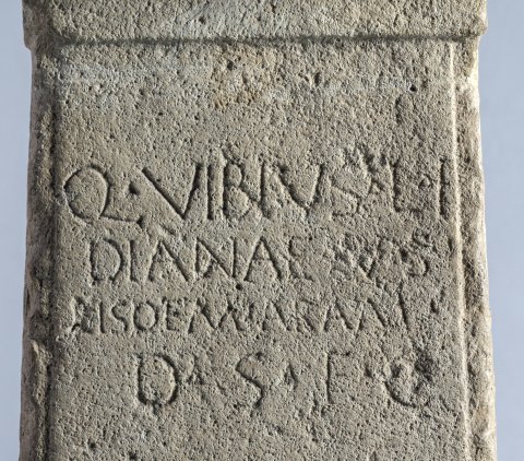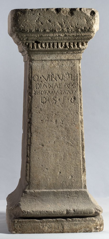 - Q(uintus) Vibius L(uci) f(ilius) / Dianae v(otum) s(olvit) / eisdem aram / d(e) s(uo) f(aciendum) c(uravit)