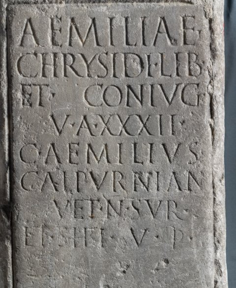 - D(is) M(anibus) // Aemiliae / Chrysidi lib(ertae) / et coniug(i) / v(ixit) a(nnos) XXXII / C(aius) Aemilius / Calpurnian(us) / vet(eranus) n(atione) Sur(us)(!) / et sibi v(ivus) p(osuit)